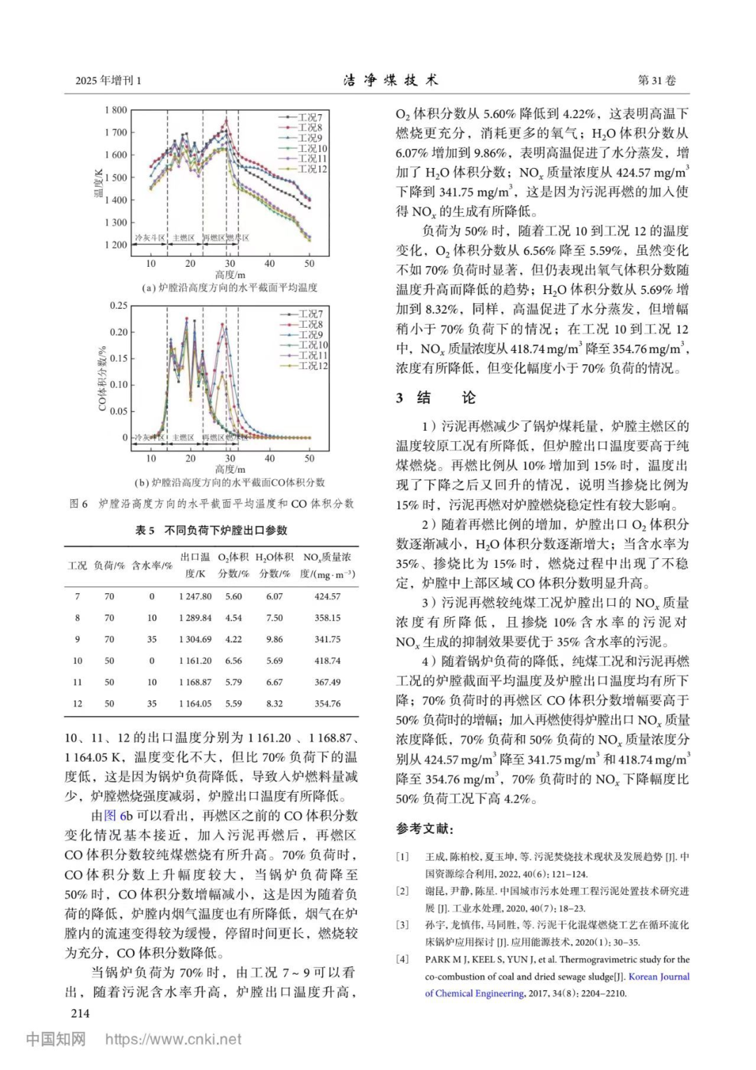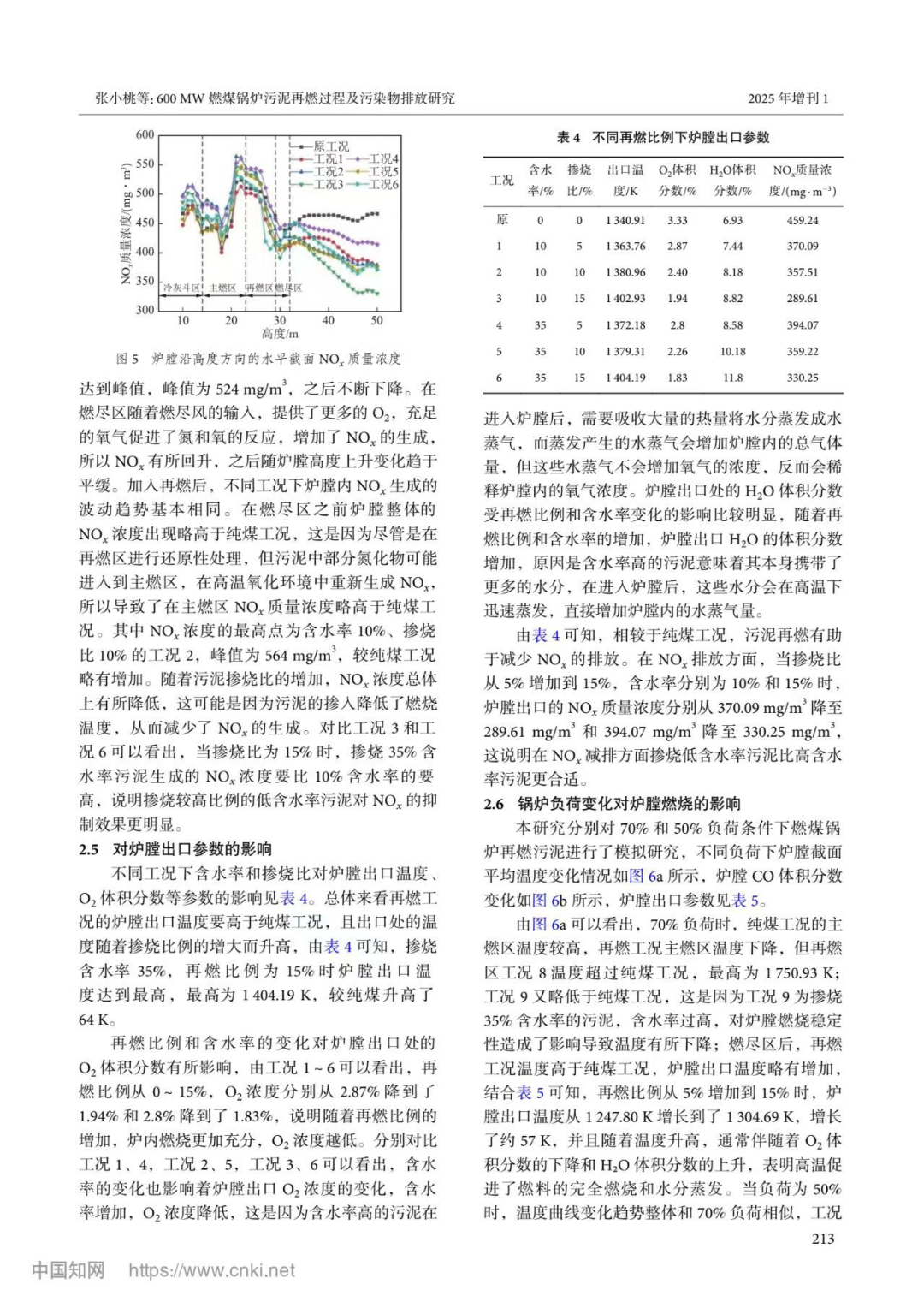 摘要:为了研究污泥再燃比例、含水率和锅炉负荷对燃煤锅炉燃烧特性的影响,选取某 600 MW 煤粉锅炉为研究对象,对锅炉燃烧器进行改造,在主燃烧区与燃尽区之间增设再燃区,研究污泥再燃对锅炉温度场、组分场以及污染物 NOx 排放浓度的影响。结果表明:污泥再燃引起锅炉主燃烧区温度降低,但炉膛出口烟气温度上升,污染物 NOx 浓度降低。随着污泥再燃比例的增加,炉膛出口 O2 体积分数逐渐减小,H2O 体积分数逐渐增大,再燃比例不高于 10% 时,炉膛燃烧稳定,主燃区温度变化趋势接近;当再燃比例达到 15% 时,污泥再燃对炉膛燃烧稳定性有较大影响,且炉膛中上部 CO 含量明显增多;污泥含水率从 10% 上升到 35%,炉膛整体温度下降 10~15 K,炉膛出口的 O2 体积分数变化不大,H2O 体积分数从 8.82% 上涨到了 11.8%;10% 含水率的污泥再燃出口 NOx 均要低于 35% 含水率的再燃工况;锅炉负荷降低至 70% 和 50% 时,加入污泥再燃,炉膛出口的 NOx 质量浓度分别从424.57 mg/m3 降至 341.75 mg/m3 和 418.74 mg/m3 降至 354.76 mg/m3。