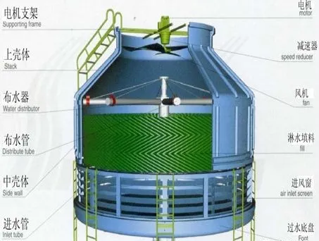 开式冷却塔的冷却原理就是,通过将循环水以喷雾方式,喷淋到玻璃纤维的填料上,通过水与空气的接触,达到换热,再有风机带动塔内气流循环,将与水换热后的热气流带出,从而达到冷却。此种冷却方式,首期的投入比较的少,但是运营成本较高(水耗、电耗)。